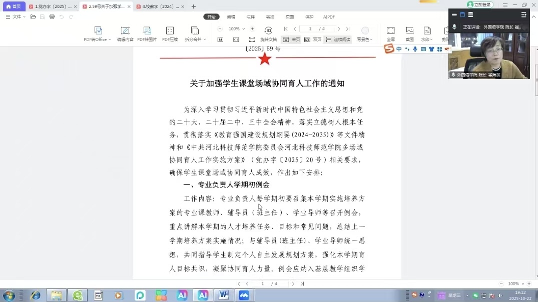 2025年10月22日晚,外国语学院组织召开线上专题工作会议,重点学习《多场域协同育人工作实施方案》(〔党办字 25〕 20号)、《关于加强学生课堂场域协同育人工作的通知》(〔2025〕59 号)、《本科生学业导师管理办法 》(校教字〔2024〕 25号)等文件。会议由崔海英院长主持,学院领导班子成员、教学部主任及专业负责人参加。